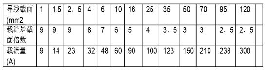 注:銅芯絕緣線的載流量要比同規(guī)格鋁線略大一些,可選擇比鋁線加大一個線號的載流量。如16mm2銅線的載流量,可按25mm2鋁線計算。