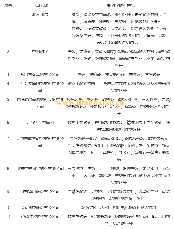 2、擁有高技術(shù)和深加工的廠家,以北京利爾、中鋼耐火、魯陽股份、濮耐股份、瑞泰科技等為代表,這些廠商技術(shù)先進,耐火材料品種多樣化,市場應用廣。